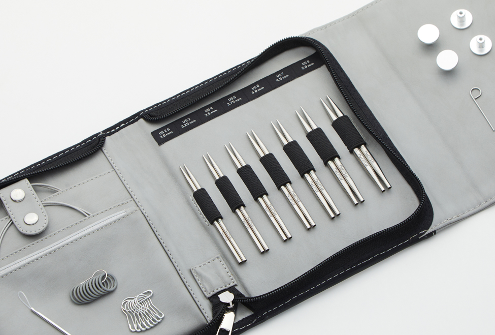 Flexible swivel stainless steel cables and accessories complement the tips, ensuring a smooth, hassle-free knitting experience. Each set is housed in a beautifully crafted vegan-leather case, both elegant and practical, keeping your needles and accessories organized, protected, and ready for knitting on the go.