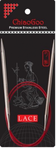The premium fixed RED Lace Stainless Steel Circulars are available in six different lengths ranging from 16" (40 cm) through 60" (150 cm). They have the same awesome red, memory-free cable, perfect joins and overall quality like the ChiaoGoo original REDs. Made of surgical-grade stainless steel they have a smooth, satin-sheen finish that won't reflect any light making it hard to see yoru work. The spectacular lace tips and joins are precisely machined and are lightweight and strong. Needle size is laser imprinted on each circular. Great for both lace and non-lace prjects!